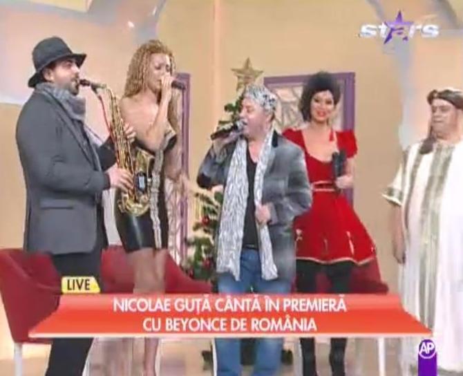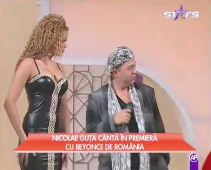 Beyonce de România este îndrăgostită până peste urechi de Guţă şi nu se sfieşte să recunoască acest lucru. Sentimentul este unul reciproc, sau cel puţin asta înţelegem din faptul că Nicolae Guţă o plimbă pe Beyonce peste tot după el. De această dată au fost prezenţi în emisiunea Adrianei Bahmuţeanu de la Antena Stars. Până aici toate bune şi frumoase, însă când s-au ridicat de pe canapea să cânte... surpriză, Beyonce de România este cu trei capete mai mare decât Guţă. Putem privi totuşi partea bună, manelistul ajunge cu faţa fix unde trebuie.