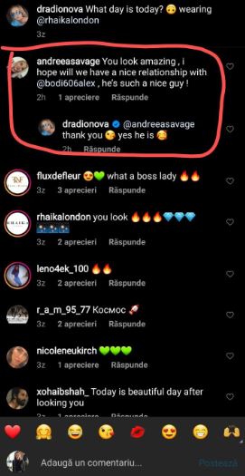 ”Arăți minunat! Sper să ai o relație frumoasă cu @bodi606alex. El e un tip atât de drăguț”, a fost mesajul pe care l-a scris urmăritoarea. ”Mulțumesc! Da, chiar este!”, a răspuns imediat Daria.