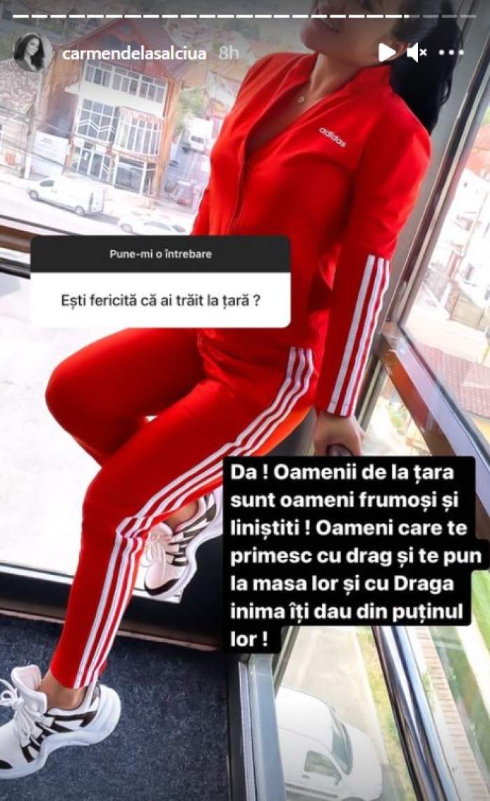 După ce le-a arătat urmăritorilor ei de pe Instagram o poză cu satul ei, Sălciua de Jos din județul Alba, Carmen a fost întrebată de un fan dacă este fericită că a trăit la țară. Răspunsul artistei a fost categoric.