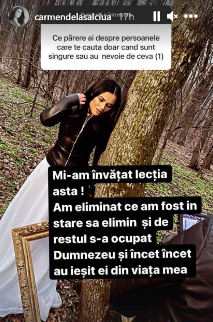 Ba mai mult, vedeta și-a îndemnat fanii să elimine din viața lor persoanele toxice, care nu sunt de încredere și să fie mai prudenți când vine vorba de relațiile cu cei din jur. De asemenea, Carmen de la Sălciua îi învață mereu pe internauți că fără credință și rugăciune, nu își vor găsi liniștea sufletească.