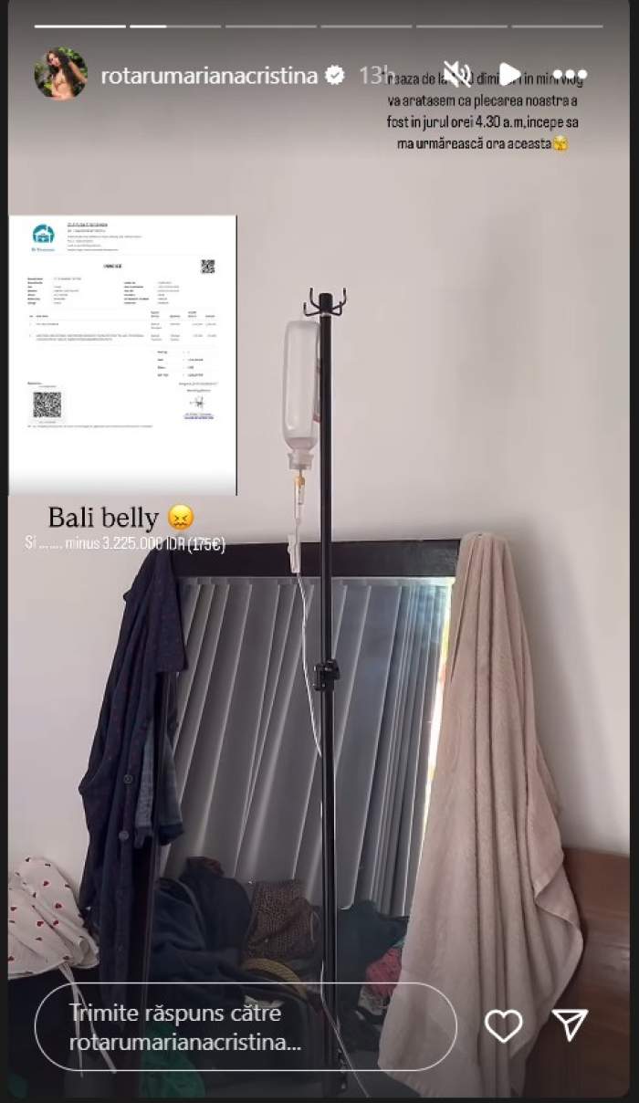 Cristina Rotaru s-a afișat cu perfuzia la mână în vacanță. Iubita lui Andrei a postat un videoclip pe Instagram în care se vede că ea are de luat mai multe pastile, asta pentru că se confruntă cu Bali belly, cunoscută drept diareea călătorului.