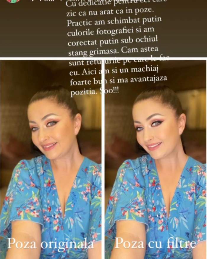 Așa cum puteți orbserva în galeria foto, diferența aproape că este insesizabilă, tocmai pentru că filtrele pe care vedeta le folosește sunt extrem de fine. În plus, soția lui Tavi Clonda le-a precizat răutăcioșilor că, de fapt, tot secretul stă în make-up și în felul în care alege să se poziționeze, atunci când se lasă fotografiată.