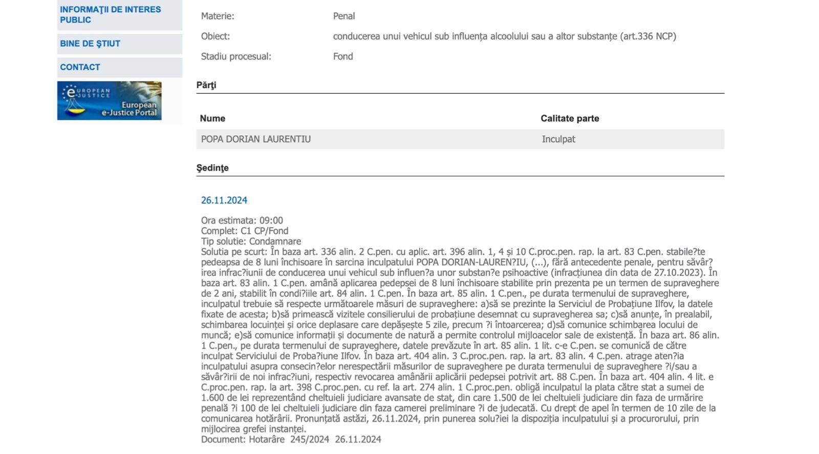 „În baza art. 396 alin. 1 și 4 din C.pen, rap. la art. 83 din C.pen, instanța stabilește pedeapsa de 8 luni închisoare în sarcina inculpatului POPA DORIAN-LAURENȚIU pentru săvârșirea infracțiunii de conducere a unui vehicul sub influența substanțelor psihoactive (faptă prevăzută de art. 336 alin. 2 C. pen., săvârșită la data de 27.10.2023)“, se arată în decizia judecătorilor.