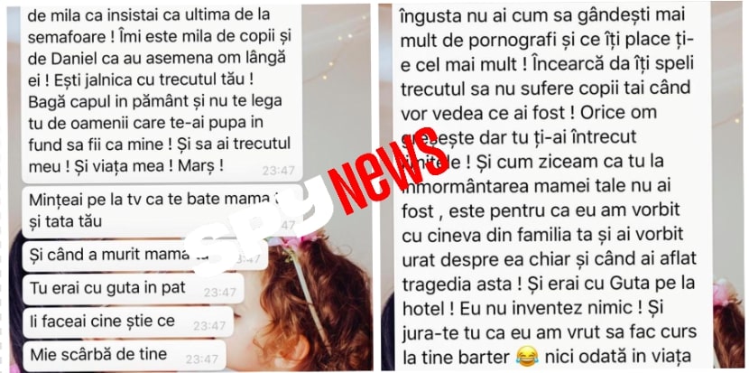 Cum arătau mesajele primite de la Simina? Ei bine, Simina i-a scris Danei Roba, printre multe altele, că: „Mințeai pe la TV că te bate mama ta și tatăl tău. Și când a murit mama ta, tu erai cu Guță în pat. Îi făceai cine știe ce. Mi-e scârbă de tine” / „Tu la înmormântarea mamei tale nu ai fost. Erai cu Guță la hotel”.