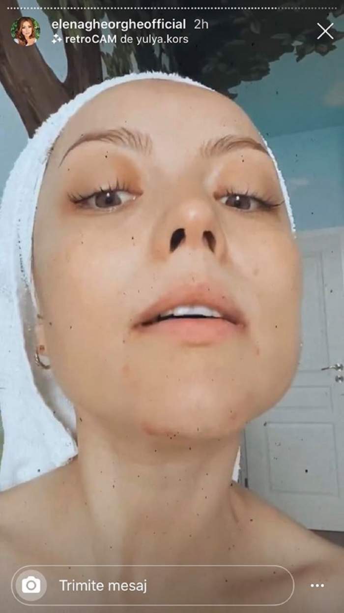 Pentru a le arăta fanilor cu ce se confruntă, Elena Gheorghe a postat mai multe InstaStory-uri prin care-și expunea tenul, fără nicio urmă de machiaj. Cu această ocazie, artista le-a mărturisit admiratorilor că, din fericire, fața sa arată acum mai bine ca înainte.