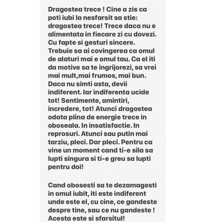 Atunci dragostea odată plină trece în oboseală. În insatisfacție. În reproșuri. Atunci sau puțin mai târziu, pleci. Dar pleci. Pentru că vine un moment când ți-e silă să lupți singură și ți-e greu să lupți pentru doi! Când obosești să te dezamăgești în omul iubit, îți este indiferent unde este el, cu cine, ce gândește despre tine, sau ce nu gândește! Acesta este și sfârșitul!”, a scris asistenta de la ”Neața cu Răzvan și Dani” pe Instagram.