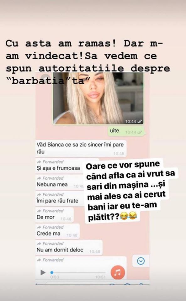 "Cu asta am rămas! Dar m-am vindecat! Să vedem ce spun acum autoritățile despre "bărbăția" ta", este mesajul scris de Bianca pe screen-ul postat.