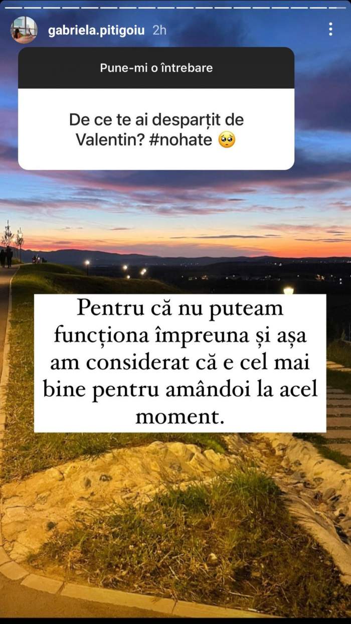 În tot acest timp, Gabriela a preferat să nu dezvăluie prea multe despre ce s-a întâmplat între ea și Valentin, dar fanii au întrebat-o pe fosta concurentă de ce au ajuns cei doi la despărțire, mai ales că păreau că sunt fericiți împreună. Gabriela a povestit că relația nu funcționa mai deloc și a considerat că este mai bine să se despartă de tatăl copilului ei.