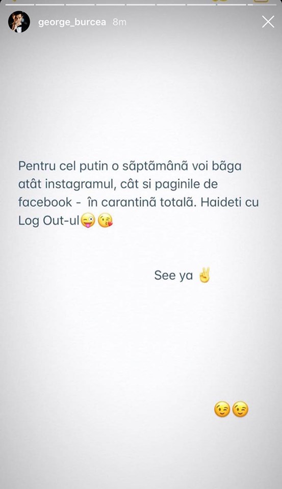 George Burcea are de gând să-și închidă pentru cel puțin o săptămână contul de Instagram, dar și paginile de Facebook: ”Pentru cel puțin o săptămână voi băga atât Instagramul, cât și paginile de Facebook - în carantină totală. Haideți cu Log Out-ul! See ya.”, le-a transmis actorul internauților.