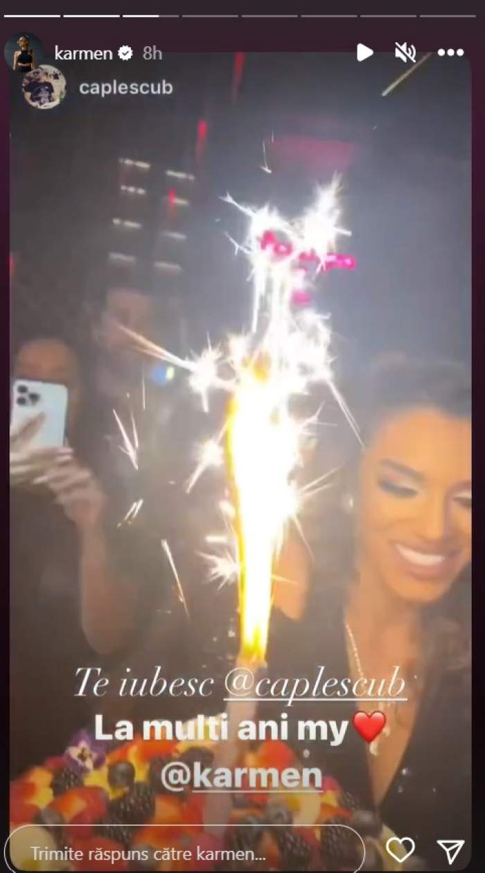 Totodată, soțul artistei i-a scris o declarație de dragoste și i-a urat ”La mulți ani!” acesteia în cadrul unui InstaStory în care a inclus momentul în care angajații localului de lux aduceau tortul și șampania scumpă cu artificii în locul în care se afla sărbătorita.