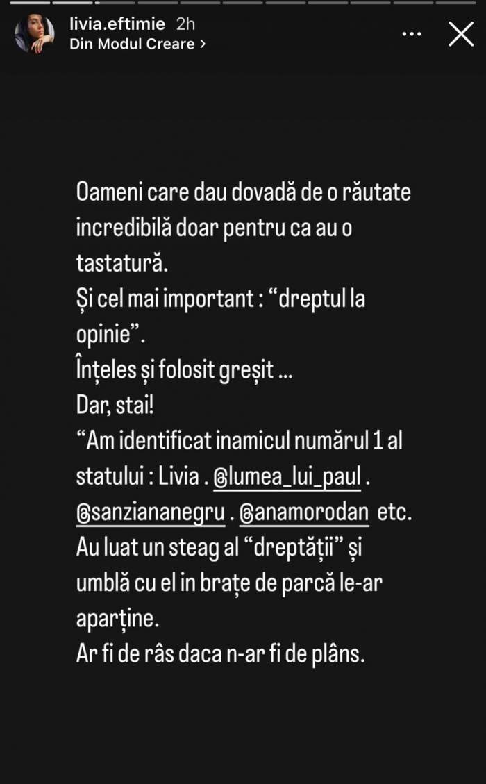 În mai multe postări de pe Instagram, Livia Eftimie spune că a fost judecată pentru ce s-a întâmplat între ea și Cătălin Bordea, fără ca oamenii să știe și partea ei de adevăr. Fosta soție a comendiantului spune că a fost surprinsă să vadă cum până și copiii și-au dat cu părerea despre ce a trăit în căsnicia cu Cătălin Bordea.