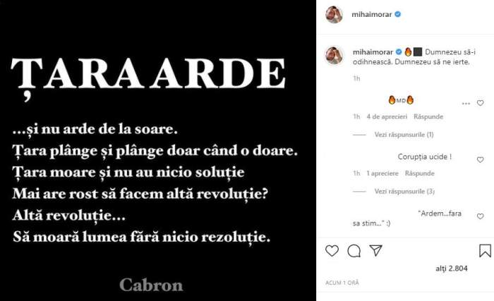 Un cuvânt de spus a avut și Mihai Morar, care a postat de la primele ore ale dimineții câteva rânduri cutremurătoare. Omul de radio este afectat de vestea cruntă și și-a împărtășit sentimentele care îl apasă cu cei de pe rețelele de socializare. La rândul lor, alte vedete consacrate din România, Cabron și Geanina Ilieș, și-au exprimat părerile în legătură cu incendiul devastator.