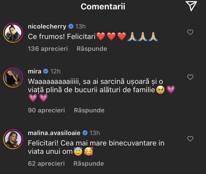 Vedetele din showbiz-ul românesc i-au transmis foarte multe mesaje Vlăduței Lupău, după ce artista a anunțat că va deveni mamă pentru a doua oară. Printre acestea se numără Alina Marymar, Larisa Udilă, Theo Rose, Ioana Grama, Nicole Cherry, Irina Manea, Mira și Mălina Avasiloaie.