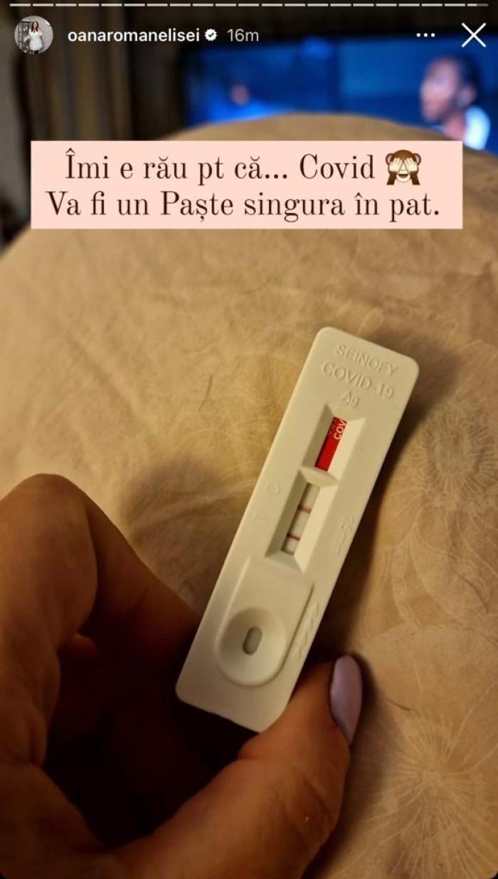 Oana Roman se simțea destul de rău, astfel că a decis să își facă un test PCR, iar rezultatul a fost unul pozitiv. Oana Roman a împărtășit cu fanii de pe rețelele de socializare imaginea și a mărturisit că va petrece Sărbătorile Pascale singură.