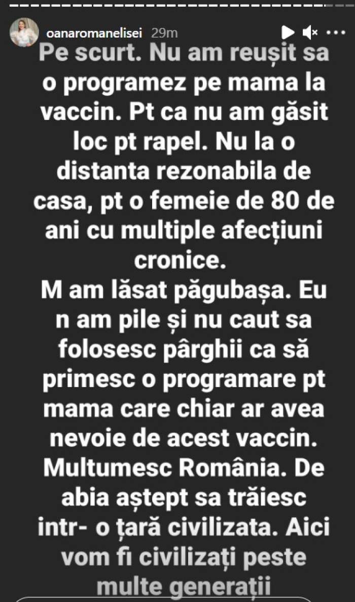 Oana Roman își dă seama pe zi ce trece că vrea să se mute cât mai repede din România. În urmă cu puțin timp, mama vedetei, Mioara Roman, a fost operată, fiind externată din spital acum două zile. Astăzi, Oana a vrut să o programeze pentru vaccinul anti-COVID, fără succes, și a decis să-și arate indignarea pe contul său de Instagram.