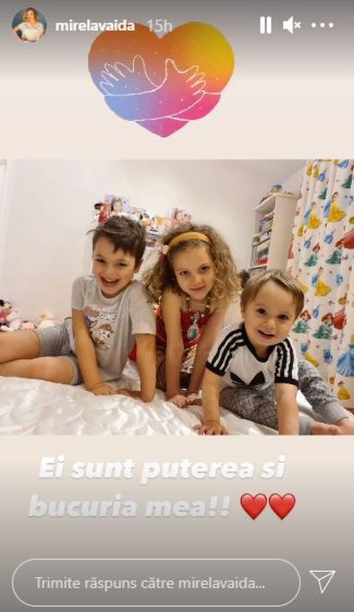 În urmă cu câteva ore, Mirela Vaida a postat pe contul de Instagram o fotografie emoționantă cu cei copii ai săi. Așa cum probabil vă așteptați, postarea celebrei prezentatoare de la ”Acces Direct” a venit însoțită de un mesaj pe măsură, Vaida susținând că micuții săi sunt cei care îi dau putere în această perioadă critică prin care trece.