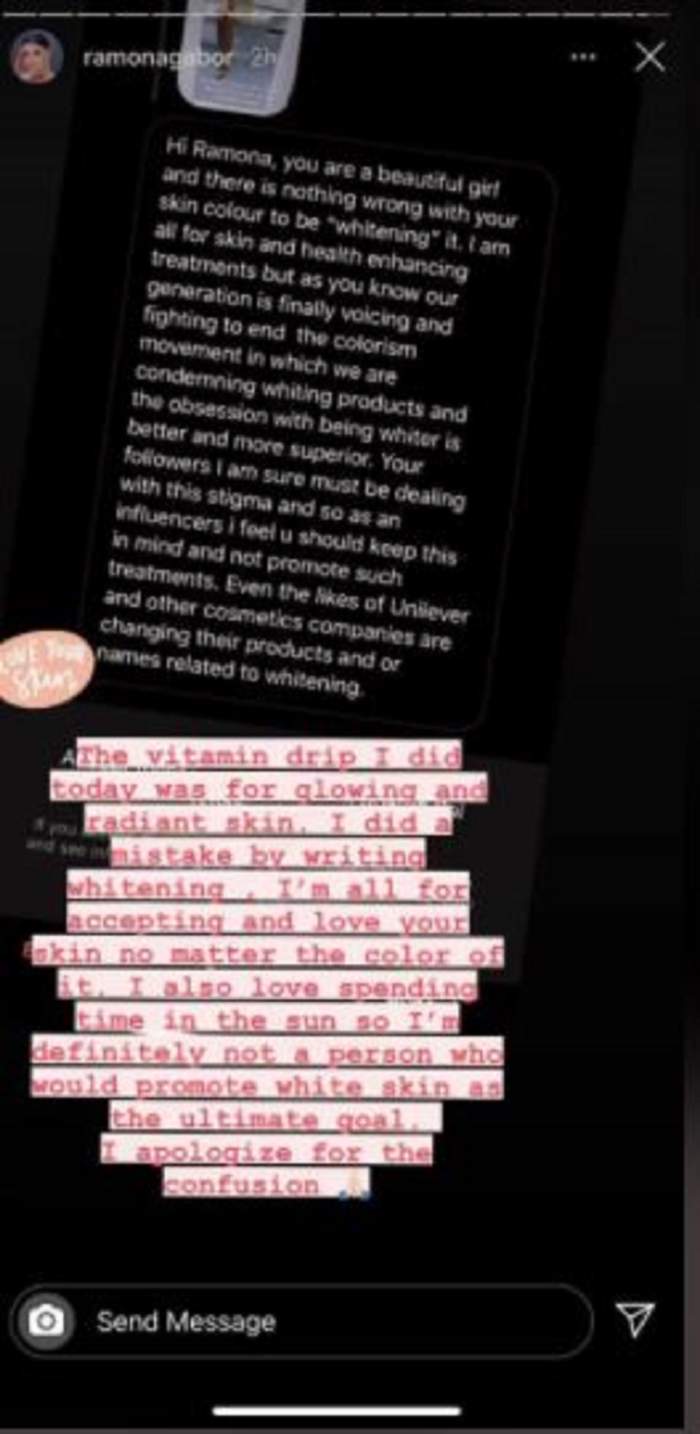Frumoasa vedetă și-a cerut imediat scuze public pentru gafa pe care a făcut-o și a afirmat că nu asta i-a fost intenția nici pentru o secundă, ci din contră! Ramona Gabor își susține urmăritorii să se iubească așa cum sunt, iar personal îi place culoarea pielii puțin mai închisă.