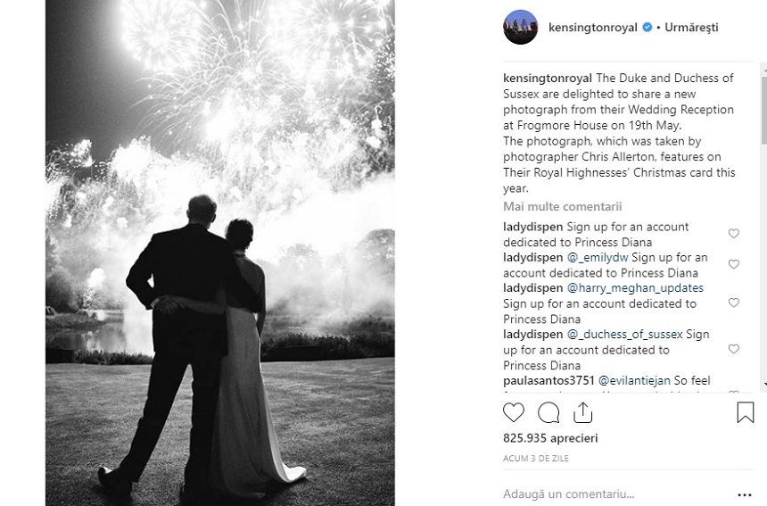 Prinţul Harry şi prinţesa Meghan au folosit o fotografie alb-negru, de la propria lor nuntă. Cuplul este surprins cu spatele admirând artificiile de la emoţionantul eveniment.