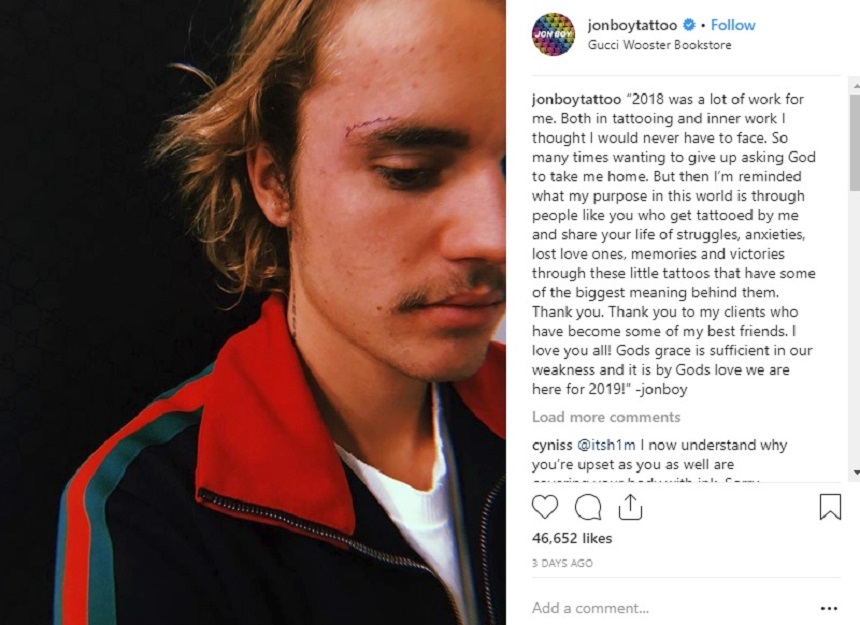 De asemenea, postarea a dezvăluit tatuajul de pe faţa lui Justin Bieber, despre care au existat multe speculaţii. Bieber are tatuat deasupra sprâncenei drepte cuvântul „grace” iar tatuajul a fost făcut de un cunoscut artist american.