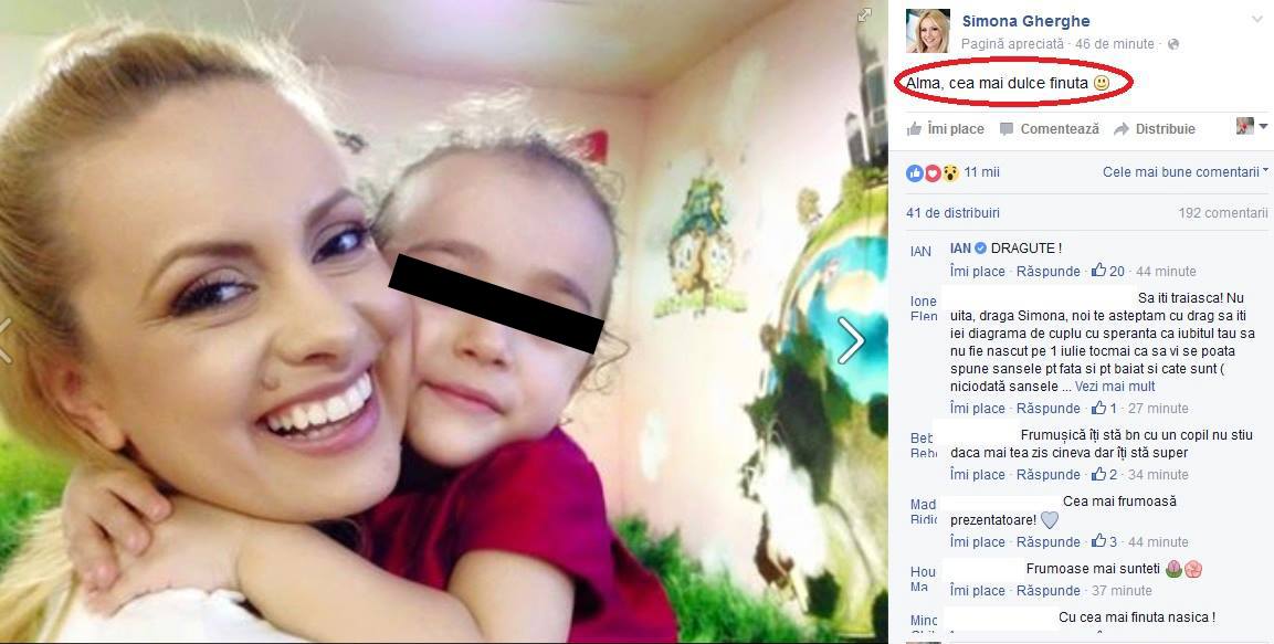 Simona Gherghe le-a făcut o surpriză prietenilor ei virtuali, pe care i-a surprins cu o imagine ce i-a făcut să viseze cu ochii deschişi. Prezentatoarea le-a prezentat-o acestora pe finuţa ei, o fetiţă de câţiva anişori, iar toţi şi-au imaginat-o în ipostază de mămică.