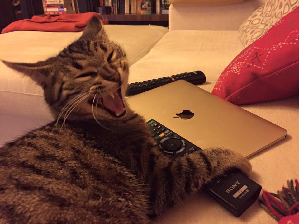 În imagine, pisica ţine la piept cu o lăbuţă telecomanda şi îşi arată colţii furios.