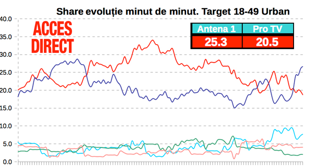 Astfel, emisiunea "Acces Direct" s-a aflat în topul preferinţelor publicului în după amiaza trecută. Antena 1 a reuşit să fie şi de această dată peste Protv. "Acces Direct" a avut un rating mediu de 6.6 şi un share de 25.3 % cotă de piaţă.