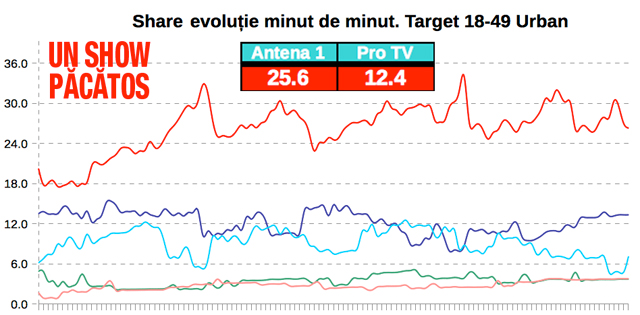 Ultima ediţie "Un show păcătos" din acest sezon a condus emisiunea lui Dan Capatos pe primul loc în preferinţele privitorilor. Late-night-show-ul a înregistrat un rating mediu de 4.6 şi un share de 25.6% cotă de piaţă, "păcătosul" umilind principalul competitor, Pro TV.