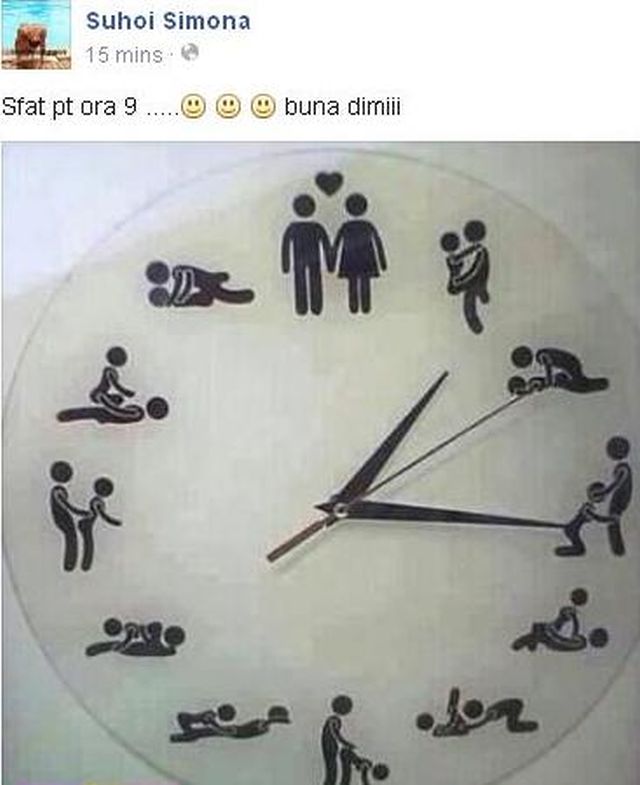 Simona Sensual le-a dat un sfat prietenilor virtuali, un sfat demn de urmat după părerea ei. Aceasta a postat pe Internet o fotografie cu un ceas imprimat cu figurine porno. Se pare că, ora 9:00 i-a atras atenţia, probabil este ora la care s-a trezit şi ea.