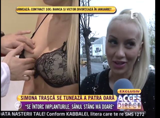 "Sânul stâng mă doare destul de des şi de vreo trei săptămâni a luat-o razna şi sânul drept. Îmi voi băga 400-450 ml şi vor fi rotunde. Cred că domnul doctor îmi va face sânii frumoşi", a declarat Simona Traşcă pentru "Acces Direct".
