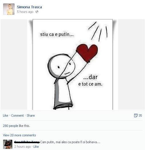 Trască a postat pe internet o fotografie cu un mare impact emoţional. Deşi majoritatea prietenilor virtuali au fost emoţionaţi de mesajul transmis de fotografie, a existat un domn mai insensibil. Mesajul Simonei suna cam aşa: "Ştiu că e puţin, dar e tot ce am...", mesajul venind însoţit de o fotografie cu un omuleţ ce-şi dăruieşte inima, iar răspunsul amicului virtual a venit fulgerător: "Cam puţin, mai ales că poate fi şi bolnavă...".