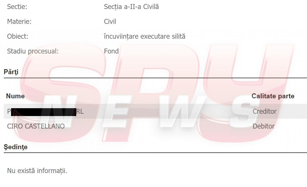 În urmă cu două zile, Ciro Castellano a fost dat în judecată de o companie specializată în recuperarea creanţelor, semn că socrul Antoniei are probleme din ce în ce mai mari cu banii. Societatea a cerut executarea silită a italianului şi a depus mai multe documente la dosar, aşa că Ciro va fi obligat să explice, în public, de ce nu şi-a achitat datoriile. Lucru destul de jenant, pentru un afacerist care până mai ieri jongla cu milioanele.