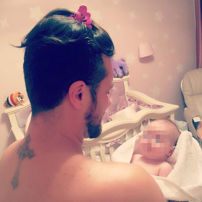 Imaginea a fost surprinsă de Gabriela Cristea aseară, după ce i-a făcut fetiţei baie, înainte de culcare. După ce s-a bălăcit şi fost luată în braţe de tatăl ei, care o privea fericit, micuţei i-a atras atenţia un obiect bizar, care îi împodobea părintelui podoaba capilară: o clamă roz, sub formă de fluture!