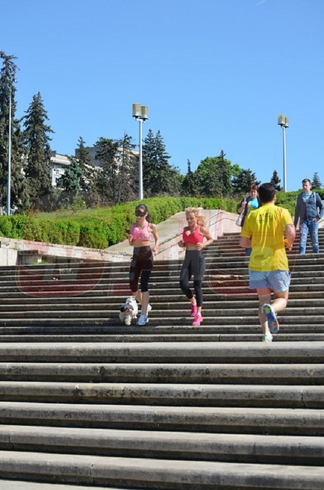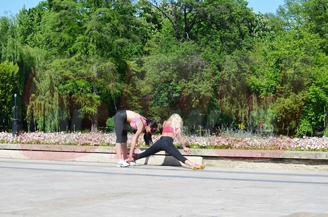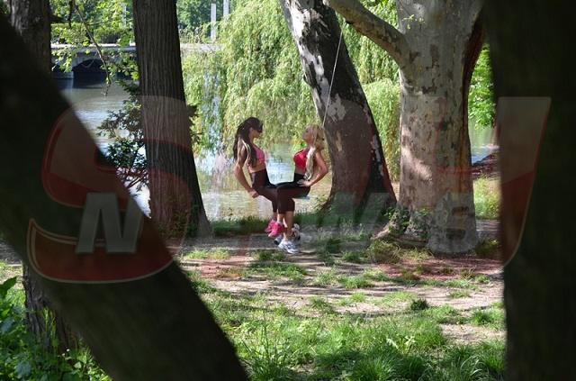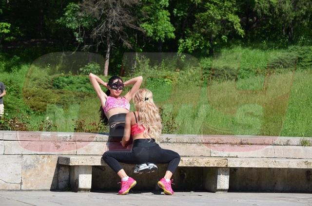 Una blondă, alta brunetă! Forme perfecte, îmbrăcăminte sexy, vreme frumoasă şi... atitudine sportivă! Cel puţin aşa se poate povesti momentul în care două cântăreţe de succes din noul val au mers în parc şi au făcut puţină mişcare.