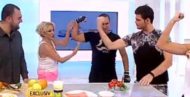 După câteva minute de sport, aceştia au căzut la pământ. Ba mai mult de atât, Rocsana i-a căzut în braţe instructorului aflat lângă ea.