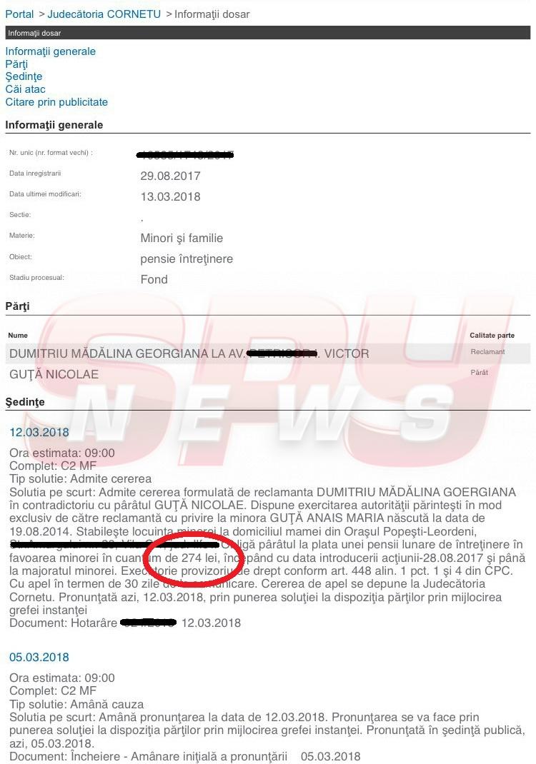 Iar sentința cu pricina este caracterizată, scurt, de mama vedetei: ”Este o rușine”. Motivele sunt chiar de înțeles, mai ales că magistrații au decis ca manelistul să plătească ”fabuloasa” sumă de 274 de lei, lunar, începând cu momentul depunerii cererii, drept pensie alimentară. Iar asta în ciuda faptului că, la fiecare cântare, Nicolae Guță, unul dintre cei mai ”scumpi” maneliști de la noi, câștigă cel puțin 2000 de euro. Iar concertele sale au loc, cel puțin, de două ori pe săptămână. Culmea, la acești bani nu se socotesc și sumele încasate din dedicații, acestea dublând - dacă nu mai mult chiar - teancurile de euro din buzunarele celebrului artist.