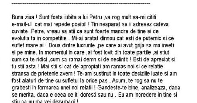 În cadrul ediţiei de luni a show-ului matrimonial a fost citită o scrisoare pe care Mădălina a transmis-o pentru fostul ei partener, Petru, în care acesta are doar cuvinte de laudă la adresa tânărului.