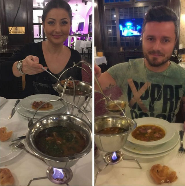 Gabriela Cristea şi Tavi Clonda au ales să mânânce fiecare câte o ciorbă... pentru început. Ei bine, cei doi şi-au făcut fiecare câte o poză pe care au pus-o într-un colaj, ce a fost urcat ulterior pe o reţea de socializare. Şi, judecând după mesajul pe care l-a scris artistul, se pare că mâncarea nu a fost tocmai gustoasă. Să-l credem pe cuvânt, având în vedere cât şi-a pus în farfurie şi cât mai era în ceaun?