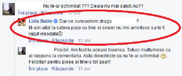 Când a văzut răspunsul artistei, bărbatul şi-a înghiţit cuvintele şi a apreciat faptul că aceasta i-a răspuns la comentariu: "Posibil. Am fost la aceeaşi biserică. Totuşi, mulţumesc că ai răspuns la comentariu. Asta dovedeşte că nu te-ai schimbat. Felicitări pentru piese şi ţine-o tot aşa".