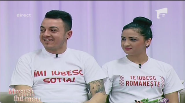 Teodor a purtat un tricou pe care era imprimat mesajul "Îmi iubesc soţia", iar Ionela, iubita lui i-a răspuns print-un alt mesaj la fel de romantic. "Te iubesc româneşte."