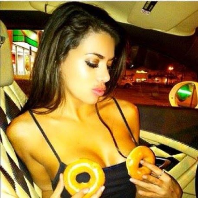 Focoasa brunetă face botic de răţuşcă şi ţine pe sâni două gogoşi. Mmm... bărbaţii tare ar mai vrea să guste din ele, din gogoşi. Bineînţeles că fata a primit sute de like-uri la imagine.