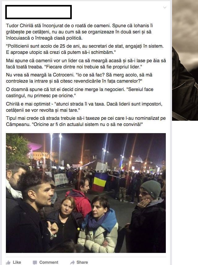 Tudor Chirilă este cunoscut pentru mesajele sale de încurajare pentru tinerii din România. În această seară, solistul trupei vama se află în mijlocul protestatarilor din centrul capitalei și vorbește cu tinerii despre situația politică din România.