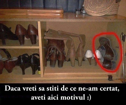 Acesta a postat pe o reţea de socializare o imagine in care apare un dulap plin cu încălţăminte de damă şi o singură perecge de pantofi de bărbaţi. Fotografia este însoţită de mesajul: "Dacă vreţi să ştiţi de ce ne-am certat, aveţi aici motivul".