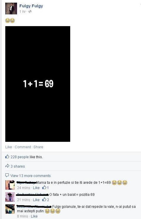 Prietenii virtuali s-au luat imediat de Fulgy, aceştia i-au corectat "greşeala" matematică, dar au subliniat şi faptul că ar trebui să fie lângă mama lui, nu să posteze prostii pe Facebook.