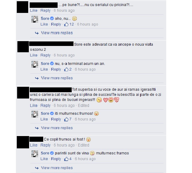 Sore a postat o poză pe facebook în care avea 10 ani şi participase la Ploaia Steluţelor. Aceasta, modestă din fire, a răspuns tuturor comentariilor pe care le-a primit. Recunoştinţa îi izvorăşte din acelaşi loc de unde îi izvorăşte şi modestia. Fata a "făcut faţă" complimentelor, spunând că "Părinţii sunt de vină".