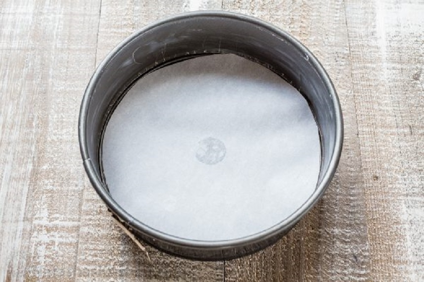 Se foloseste o tavă cu marginea detașabilă si cu diametrul de 23 de centimetri, tapetată cu o foaie de copt.