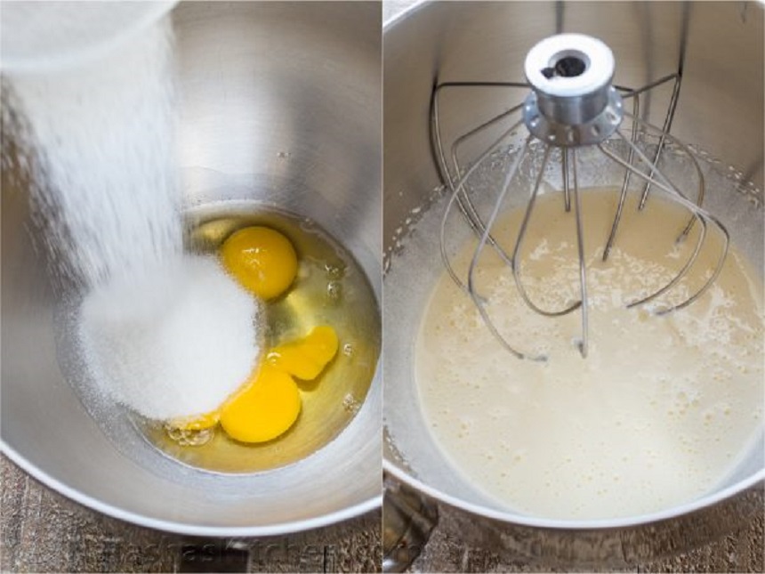 1. Într-un bol mixaţi ouăle împreună cu zahărul.