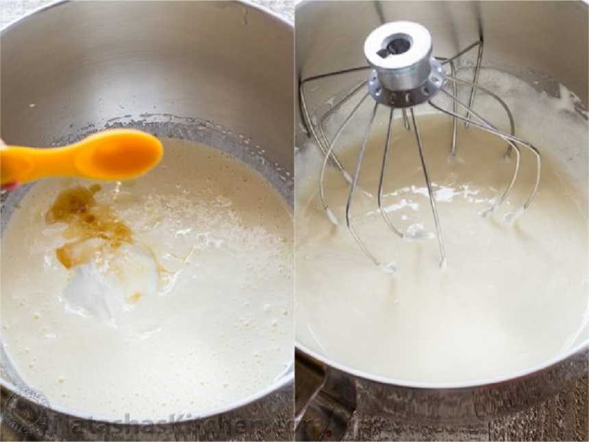 2. Adăugaţi smântâna, uleiul, esenţa de vanilie şi sarea şi mixaţi la viteză redusă până ce toate ingrediente se amestecă perfect.
