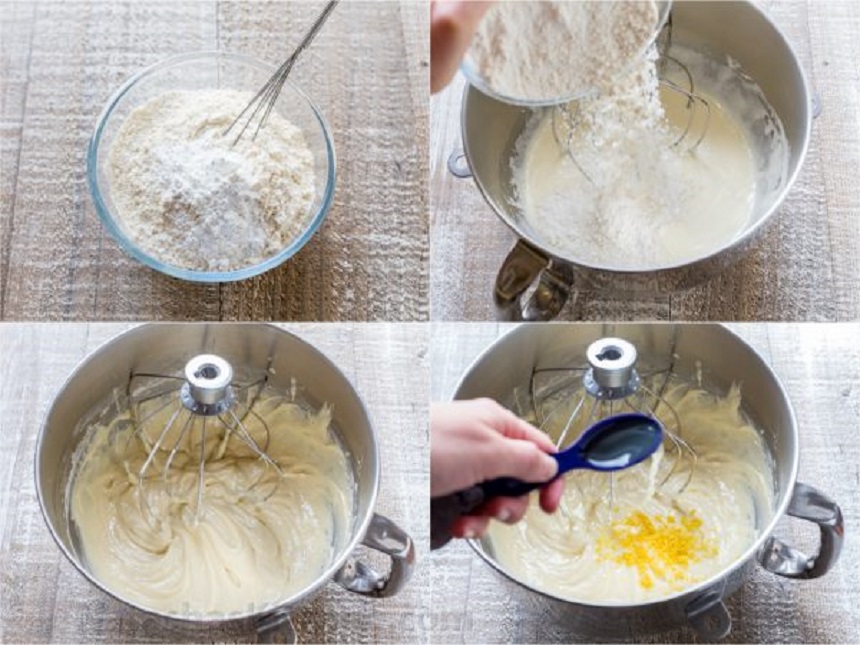 3. Într-un alt vas amestecaţi făina cu praful de copt, iar după ce acestea s-au combinat se toarnă peste compoziția din primul bol şi se amestecă până ce se obţine o compoziție omogenă. La final adăugaţi sucul de lămăie şi 1/2 linguriţă de coajă de lămăie.