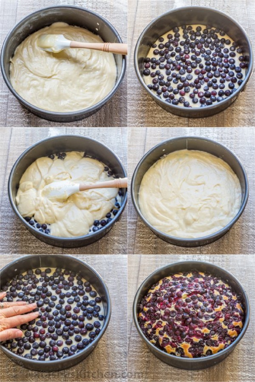 5. Turnaţi jumătate din aluatul obţinut în tava de copt şi cu ajutorul unei spatule aranjaţi-l uniform şi adăugaţi jumătate din cantitatea de afine. Apoi turnaţi restul aluatului şi pe deasupra puneți în mod unitar afinele rămase . Se coace timp de aproximativ 55 de minute la o temperatură de 190 de grade. După ce tortul este gata lăsaţi-l să se răcească timp de 15-20 minute, apoi îndepărtaţi forma de copt și adăugați zahărul pudră.