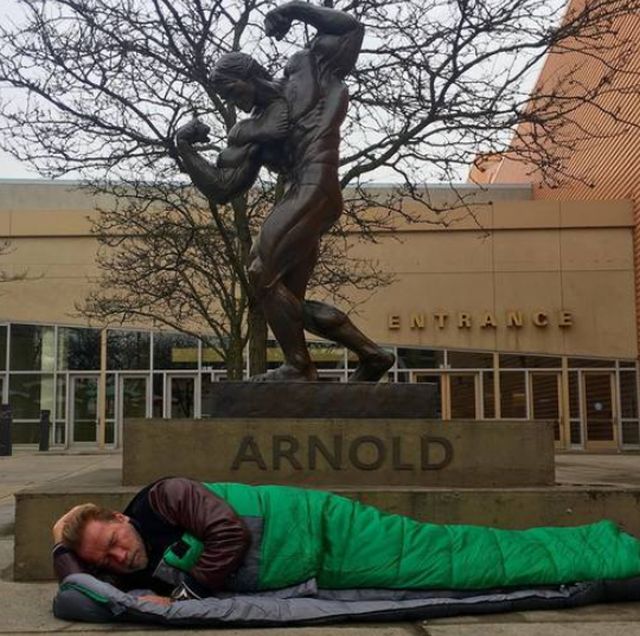 În imagine, Arnord apare dormind lângă statuia sa din faţa Greater Columbus Convention Center din Ohio. "Cum s-au schimbat vremurile", este comentariul care însoţeşte imaginea publicată de actorul în vârstă de 68 de ani.